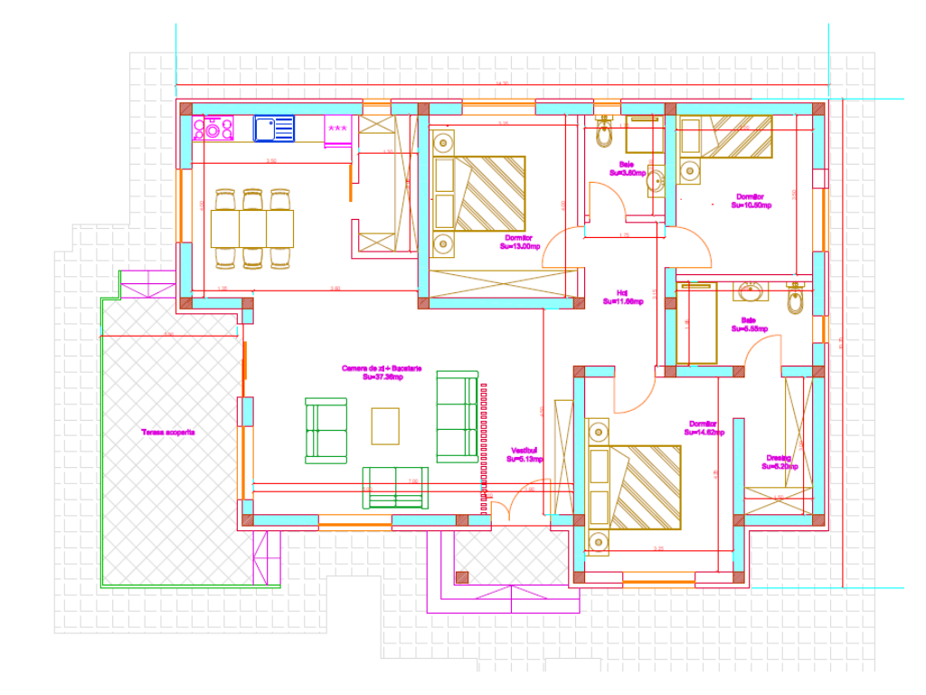 Living cu bucătărie - 37.36 mp Dormitor cu dressing - 21.12 mp Dormitor 2 - 13.00 mp Dormitor 3 / Office - 10.50 mp Baie 1 - 5.55 mp Baie 2 - 3.60 mp Hol - 11.66 mp Vestibul - 5.13 mp Suprafata construita - 134 mp Suprafata terasa acoperită - 16 mp TOTAL 150 mp TEREN 500 mp